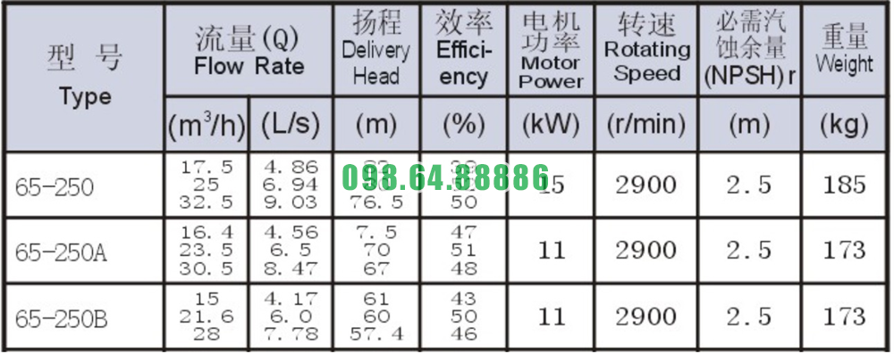 Bảng thông số kỹ thuật bơm nước li tâm trục ngang SLW65-ISW65-250 động cơ 15 kw lưu lượng max 32.5 m3/h