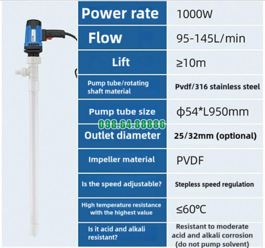 Bơm cắm điện thùng phuy model JDT-1000W-PVDF được sử dụng nhằm đáp ứng các yêu cầu này.
