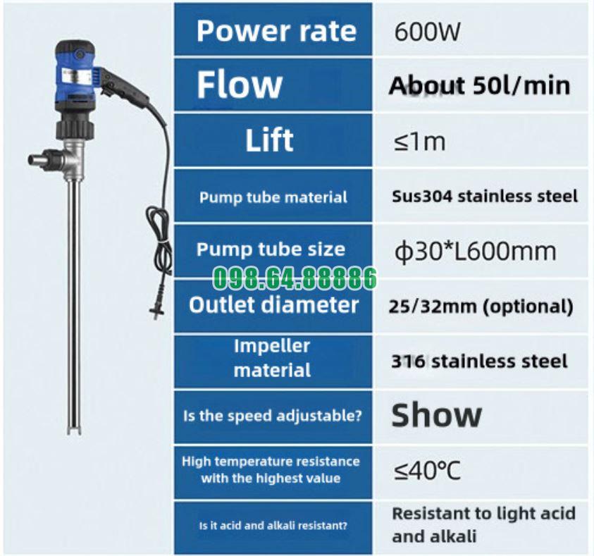 Bơm thùng phuy ống inox SUS304 JDT-600W đáp ứng hoàn hảo nhu cầu sử dụng trong môi trường công nghiệp nhờ sự kết hợp giữa động cơ mạnh mẽ, vật liệu inox cao cấp và thiết kế tinh gọn.