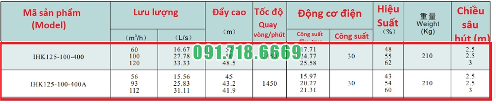 Bảng lưu lượng của máy bơm nước sạch li tâm cánh hở IHK125-100-400
