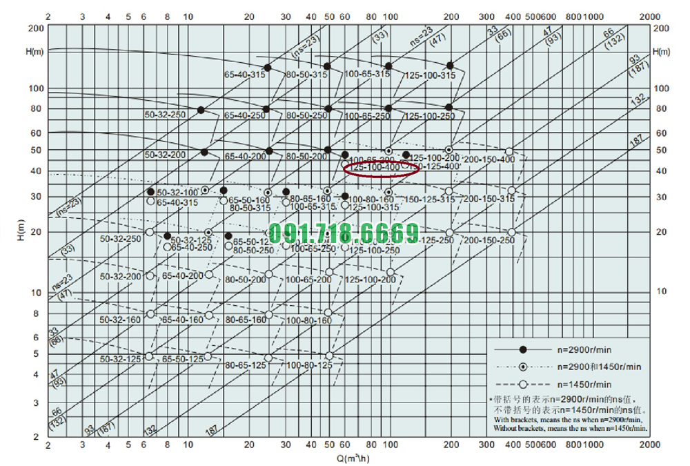 Đường cong hiệu suất của máy bơm nước sạch li tâm cánh hở IHK125-100-400
