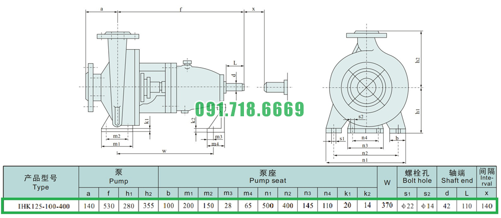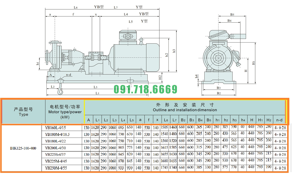 Kích thước của đầu máy bơm nước sạch li tâm cánh hở IHK125-100-400