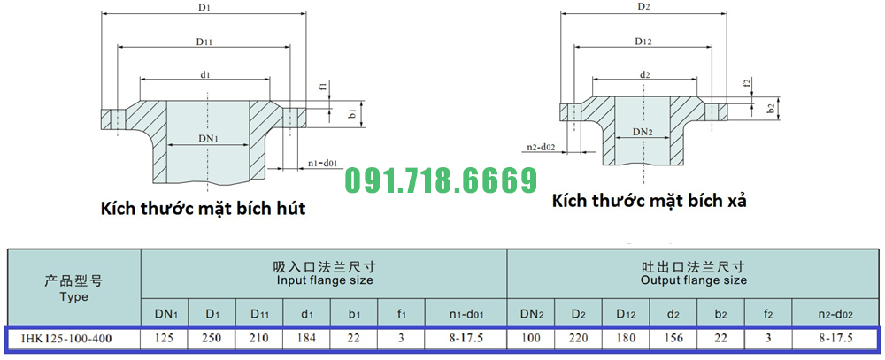 Kích thước mặt bích của máy bơm nước sạch li tâm cánh hở IHK125-100-400