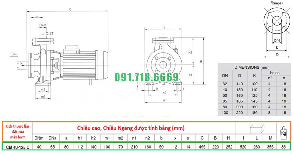 Kích thước máy bơm nước sạch li tâm CM32-125A đường thoát 40 mm