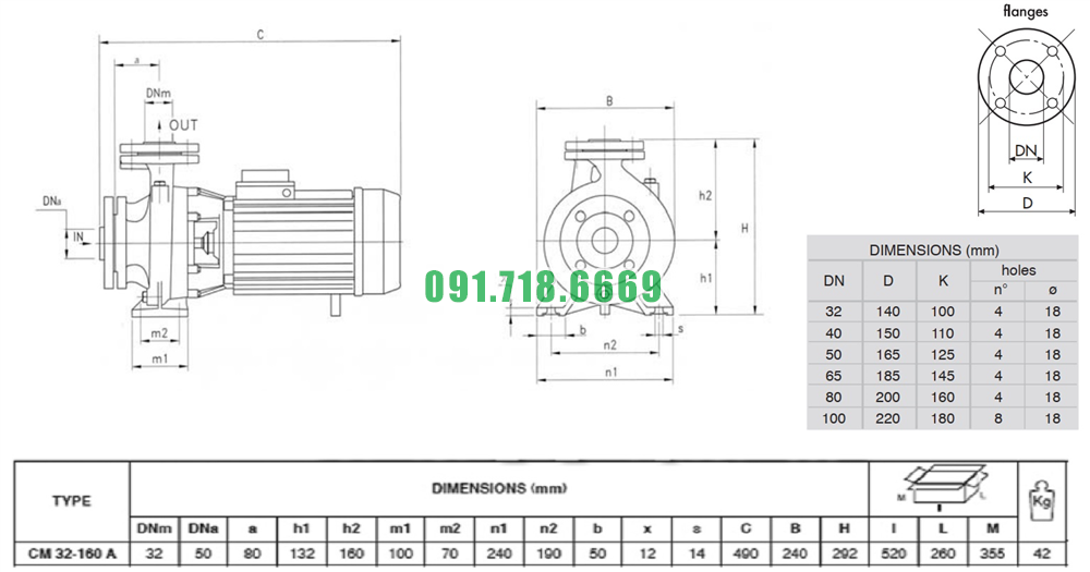 Kích thước máy bơm nước sạch li tâm CM32-160A đường thoát 32 mm