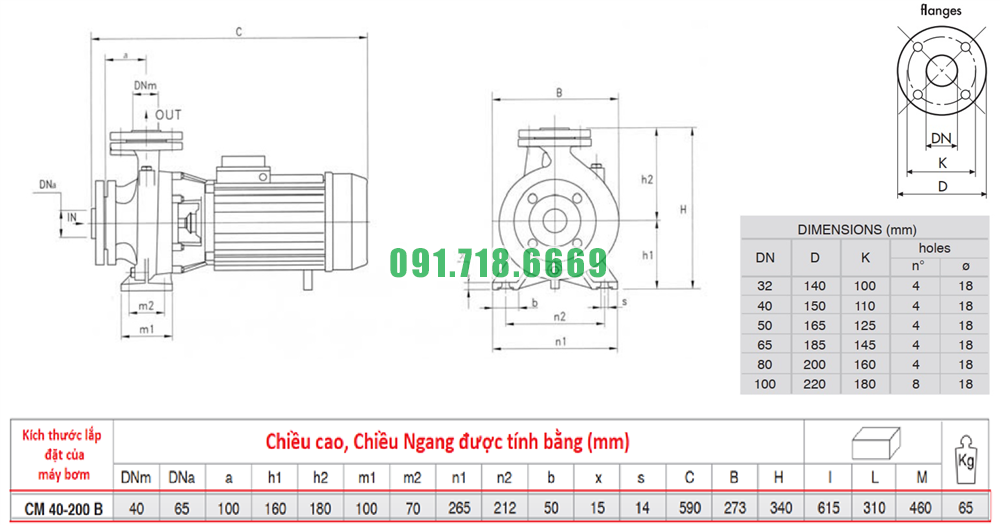 Kích thước máy bơm nước sạch li tâm CM40-200B đường thoát 40 mm