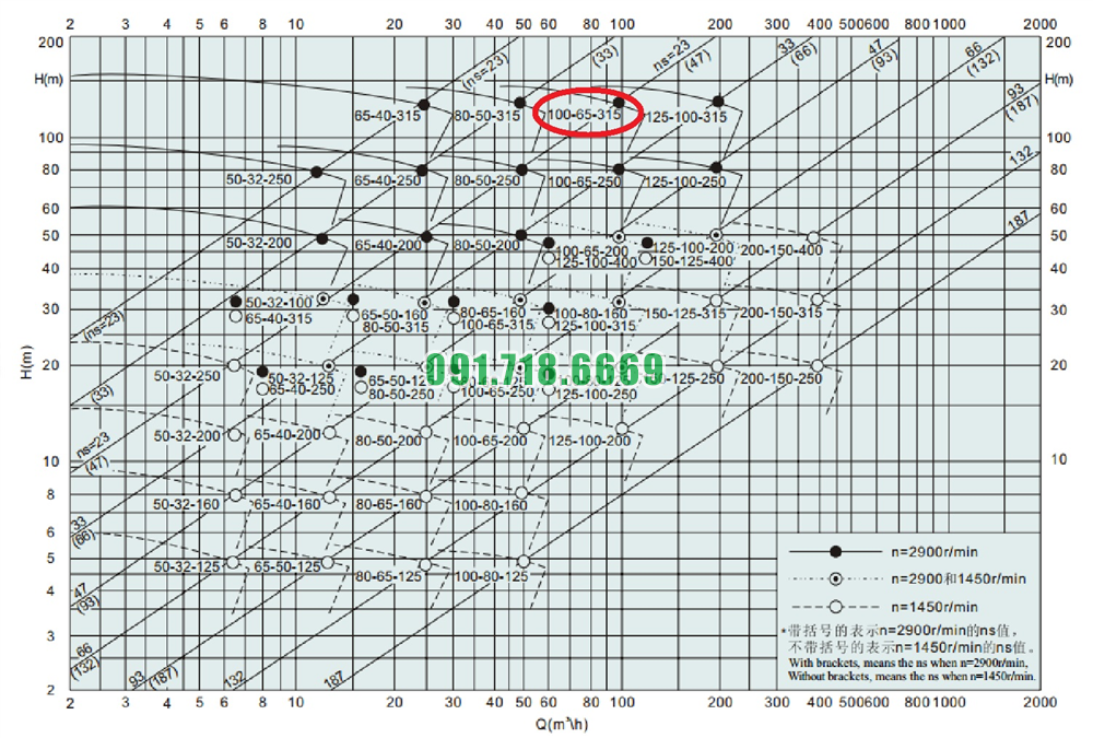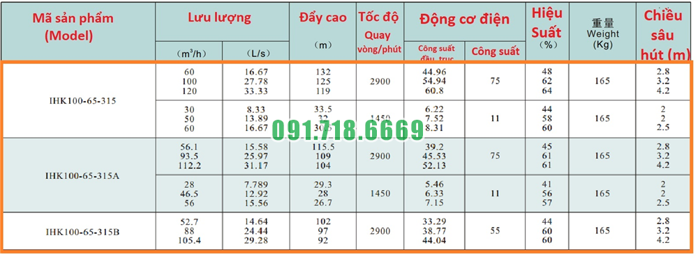 Bảng lưu lượng của bơm li tâm cánh hở model IHK100-65-315