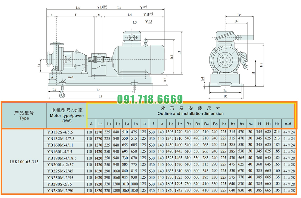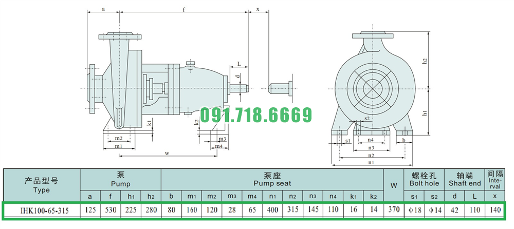 Kích thước của đầu bơm li tâm cánh hở model IHK100-65-315