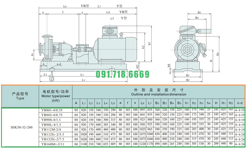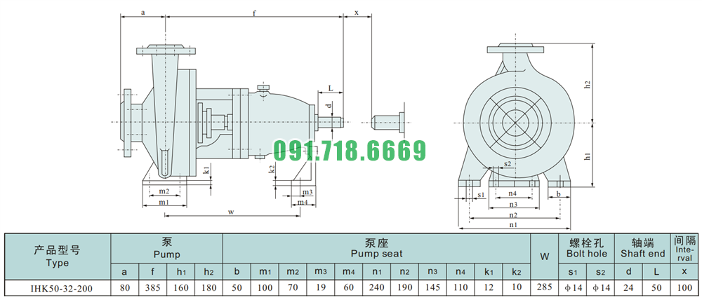 Kích thước lắp đặt của bơm li tâm cánh hở model IHK50-32-200