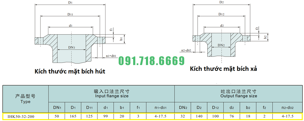 Kích thước mặt bích của bơm li tâm cánh hở model IHK50-32-200