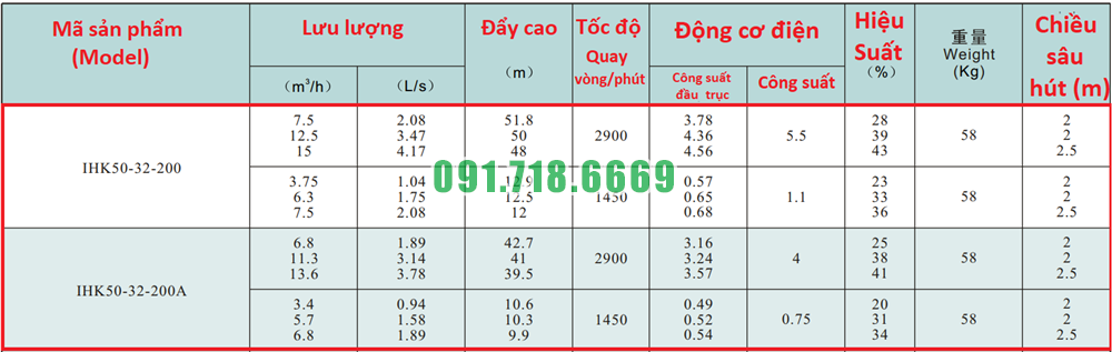 Bảng lưu lượng của bơm li tâm cánh hở model IHK50-32-200