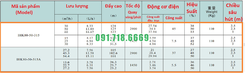 Bảng lưu lượng của bơm li tâm cánh hở model IHK80-50-315