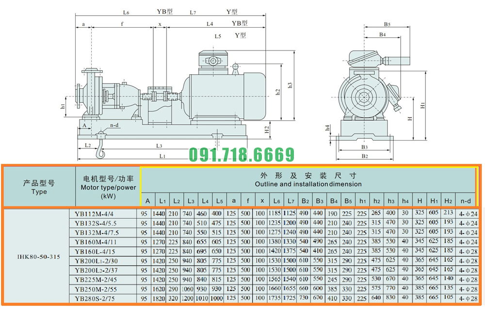Kích thước của đầu bơm li tâm cánh hở model IHK80-50-315