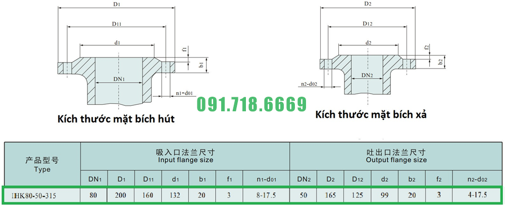 Kích thước mặt bích của bơm li tâm cánh hở model IHK80-50-315
