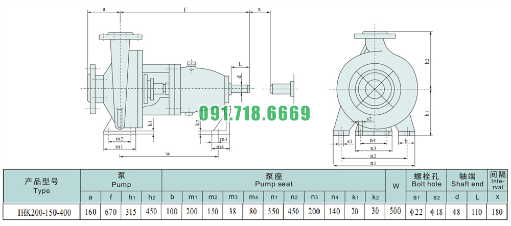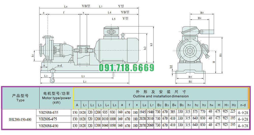 Kích thước lắp đặt của bơm li tâm cánh hở vỏ inox 316L model IHK200-150-400