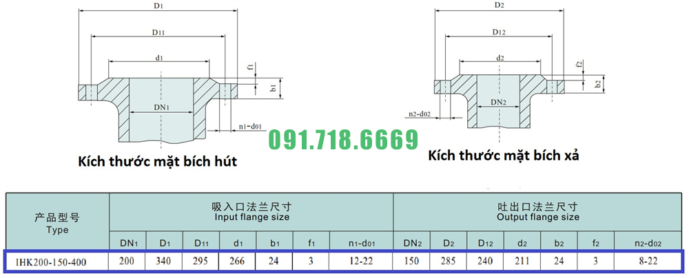 Kích thước mặt bích của bơm li tâm cánh hở vỏ inox 316L model IHK200-150-400