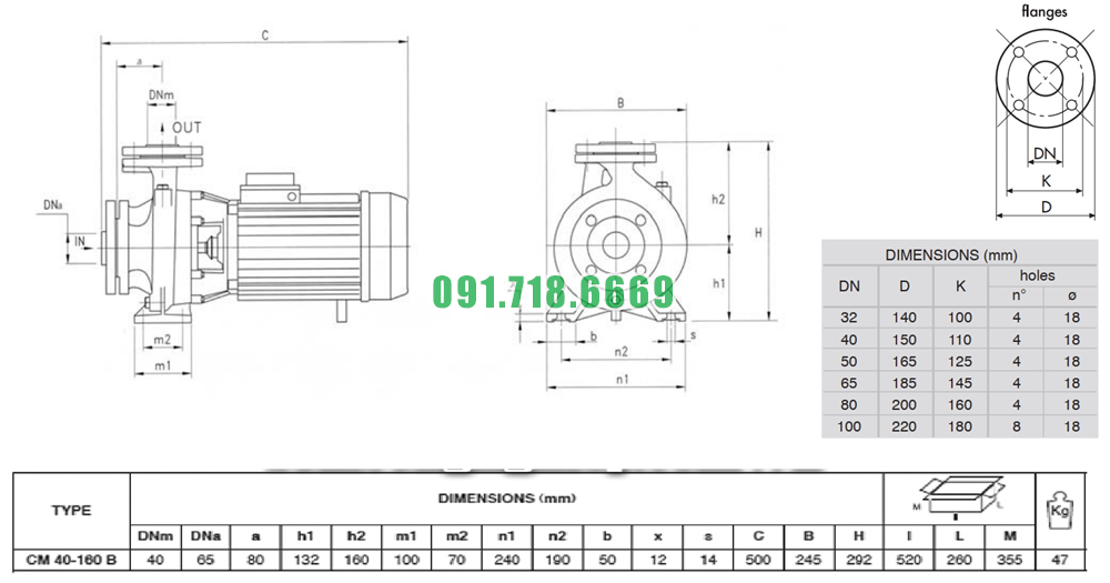 Kích thước bơm li tâm trục ngang model CM40-160B
