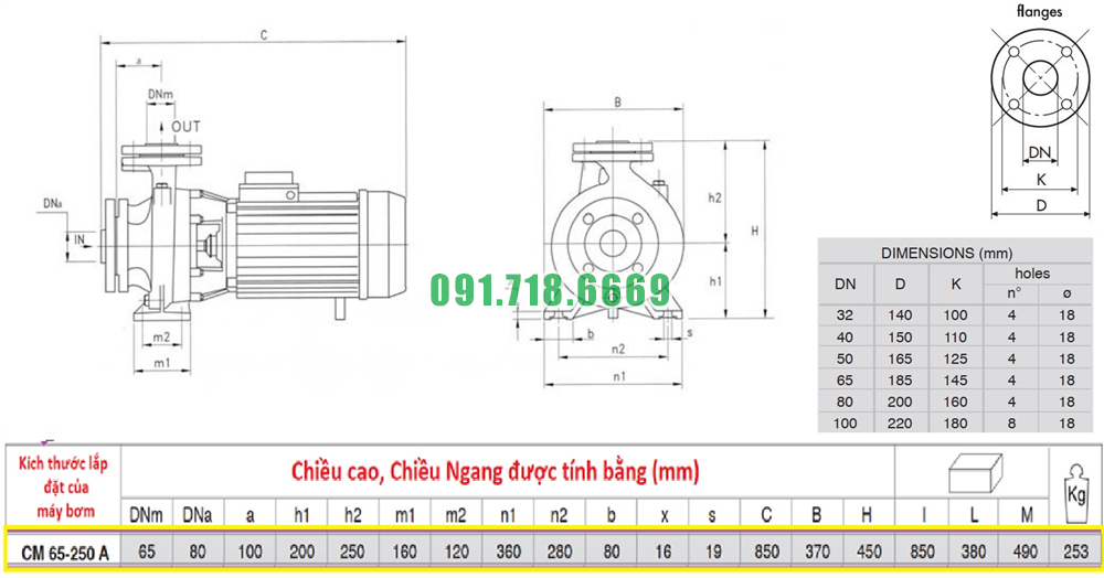 Kích thước bơm li tâm trục ngang model CM65-250A