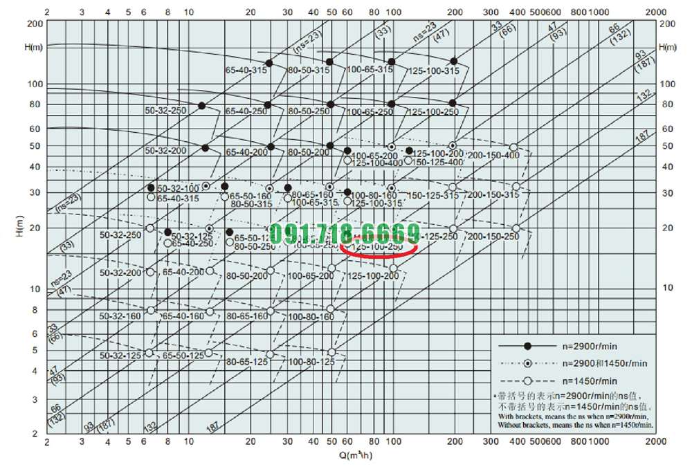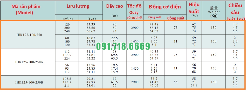 Bảng lưu lượng của máy bơm cánh hở li tâm trục ngang IHK125-100-250 điện áp 380v