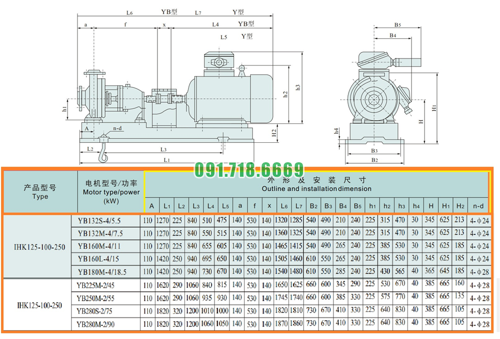 Kích thước lắp đặt của máy bơm cánh hở li tâm trục ngang IHK125-100-250 điện áp 380v