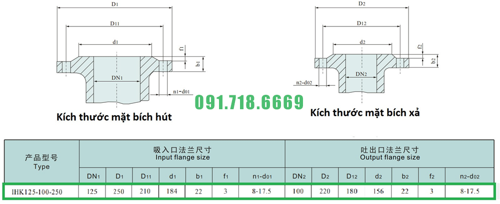 Kích thước mặt bích của máy bơm cánh hở li tâm trục ngang IHK125-100-250 điện áp 380v