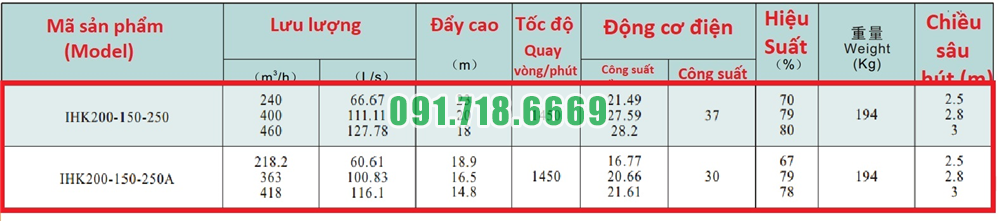 Bảng lưu lượng của máy bơm cánh hở li tâm trục ngang IHK200-150-250 inox 316