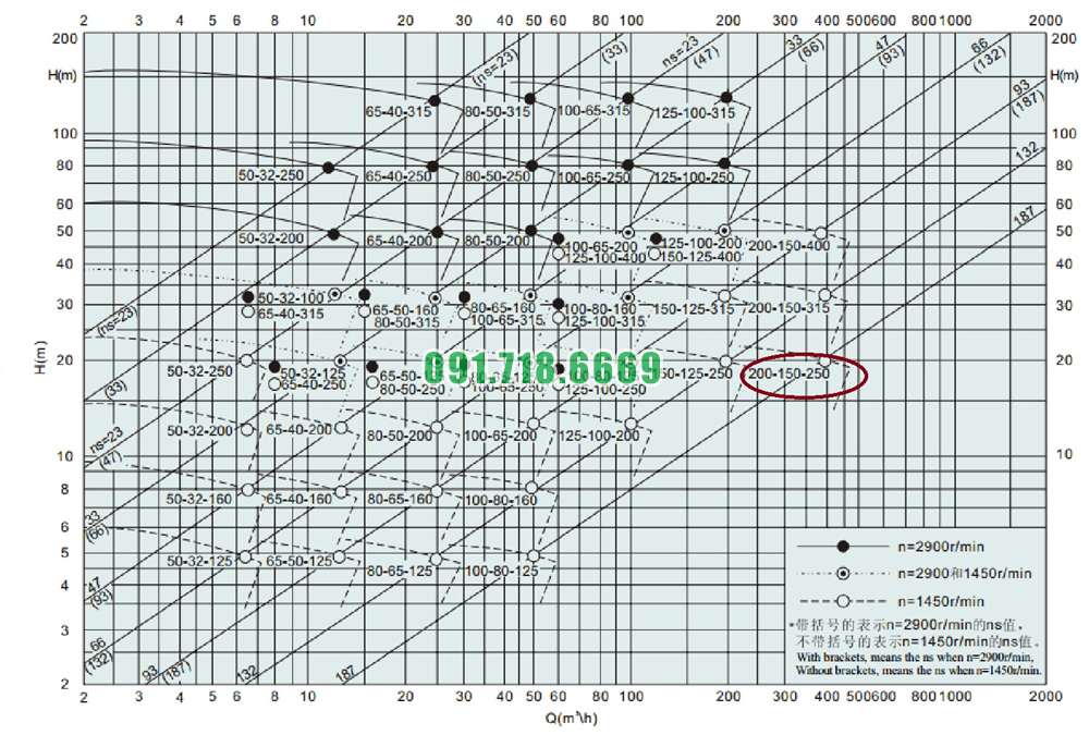 Đường cong hiệu suất của máy bơm cánh hở li tâm trục ngang IHK200-150-250 inox 316