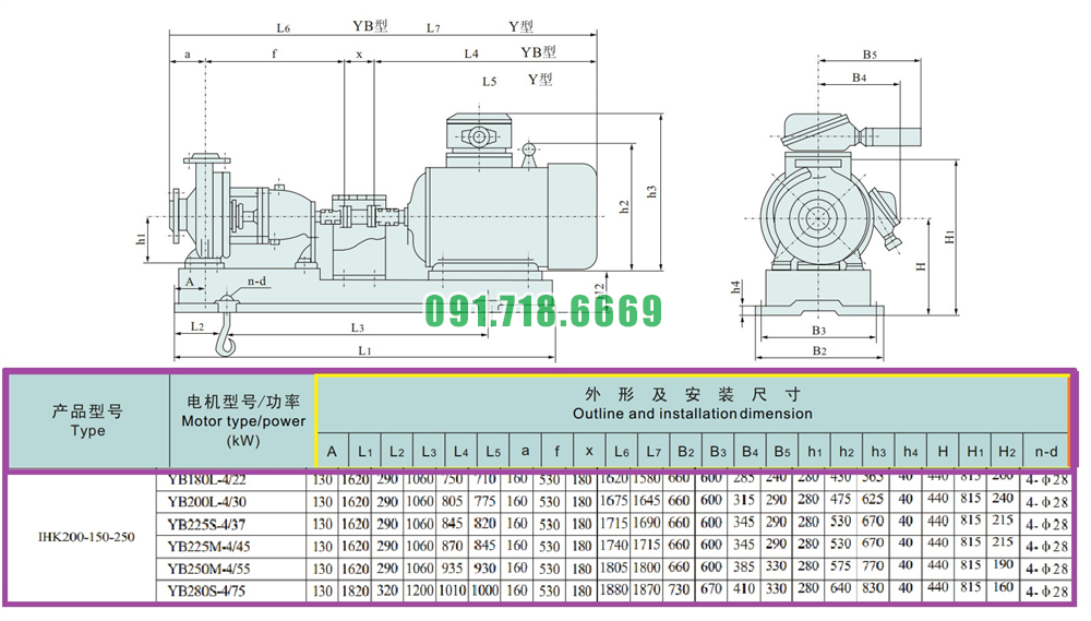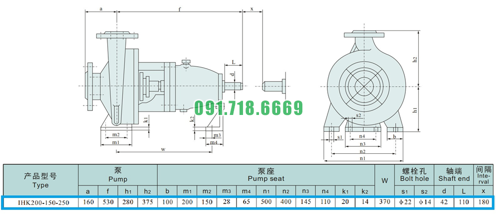 Kích thước của đầu máy bơm cánh hở li tâm trục ngang IHK200-150-250 inox 316