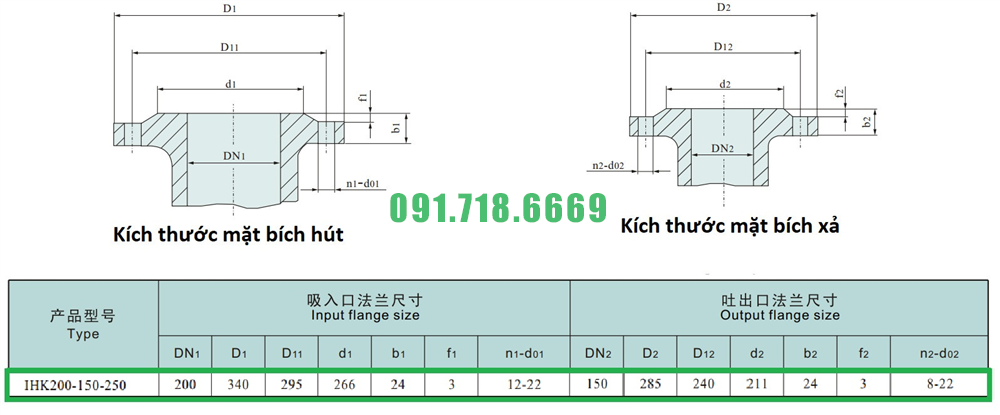 Kích thước mặt bích của máy bơm cánh hở li tâm trục ngang IHK200-150-250 inox 316