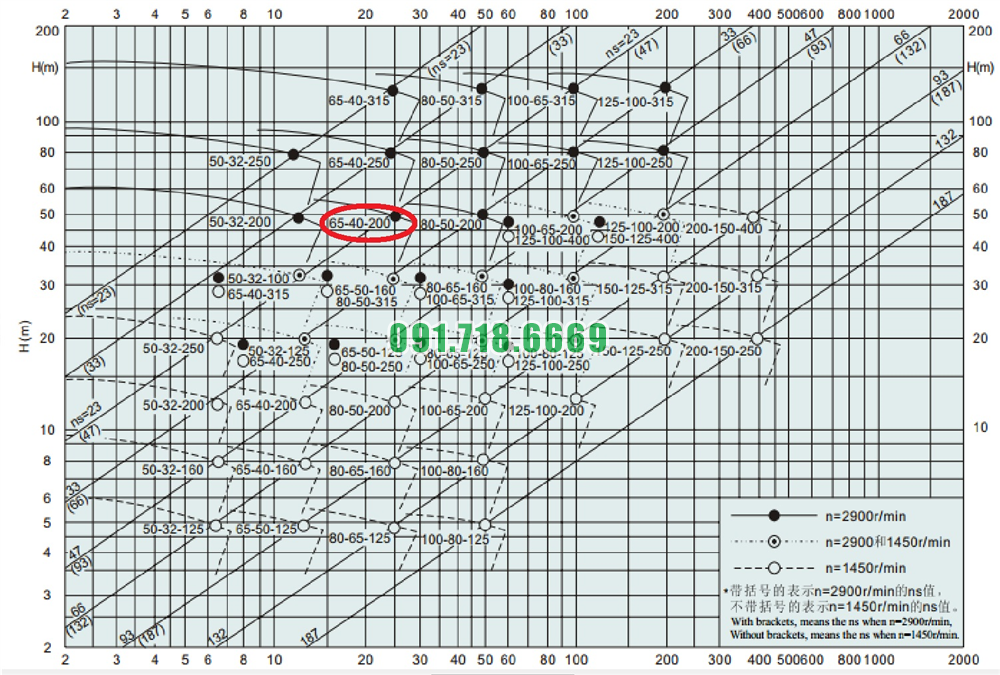 Đường cong hiệu suất của máy bơm nước công nghiệp IHK65-40-200 vật liệu inox 316L