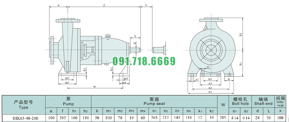 Kích thước của đầu máy bơm nước công nghiệp IHK65-40-200 vật liệu inox 316L