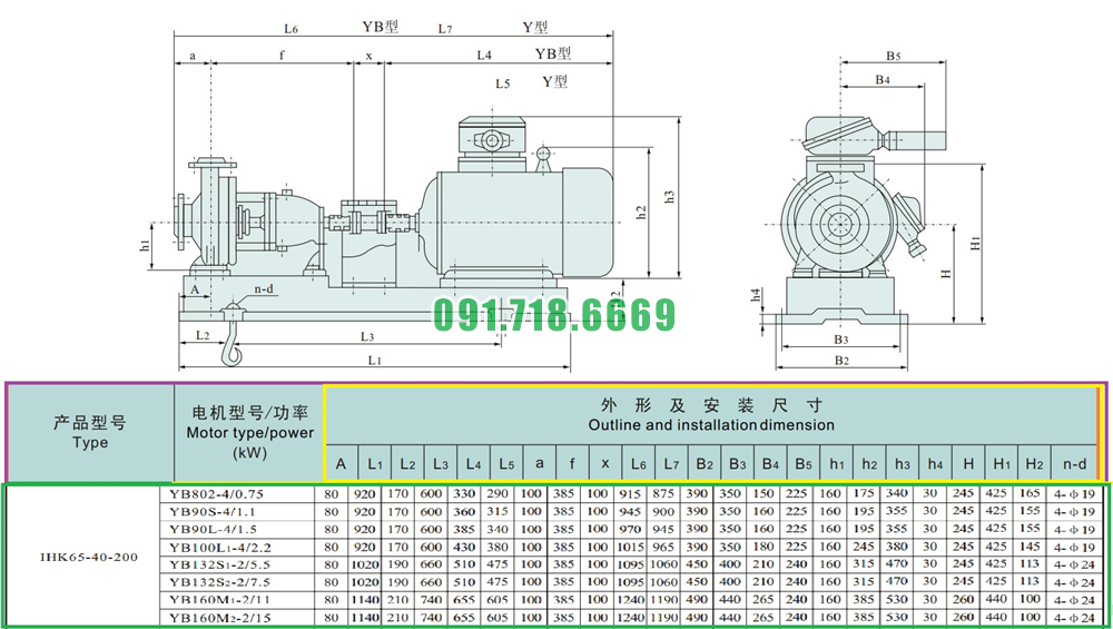Kích thước lắp đặt của máy bơm nước công nghiệp IHK65-40-200 vật liệu inox 316L