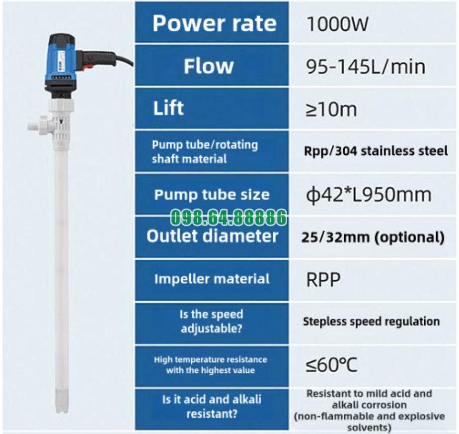 Trong quá trình vận hành của bơm công nghiệp, việc chuyển hóa điện năng thành cơ năng là nền tảng quyết định hiệu suất, độ ổn định và khả năng làm việc liên tục của thiết bị. Bơm cắm điện thùng phuy model JDT-1000W-PVDF được thiết kế tối ưu để quá trình chuyển hóa này diễn ra hiệu quả, an toàn và bền bỉ trong môi trường hóa chất.