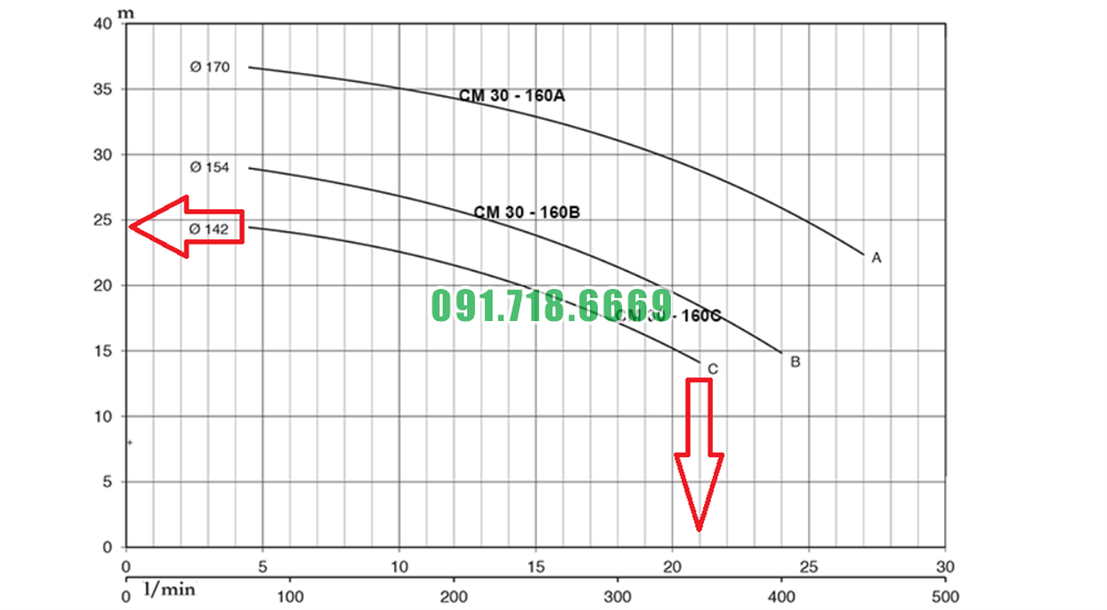 Đường cong hiệu suất máy bơm nước sạch li tâm CM32-160C đường kính 32 mm