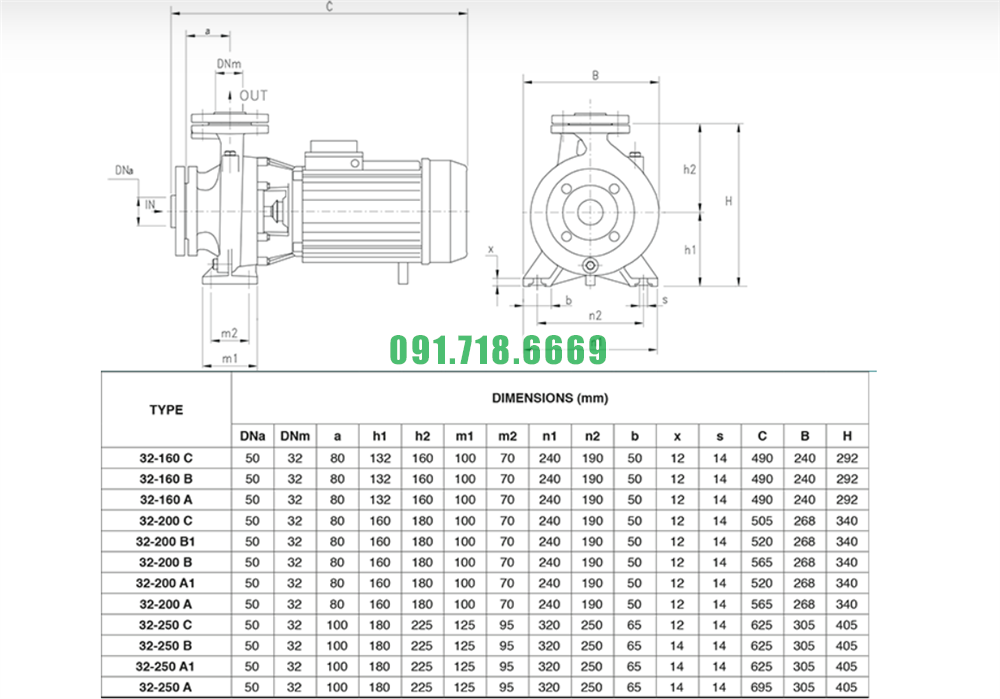 Thông số kỹ thuật máy bơm nước sạch li tâm CM32-160C đường kính 32 mm