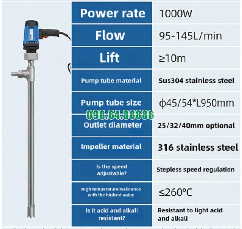Với vật liệu inox kháng hóa chất, cấu trúc kín an toàn và động cơ bảo vệ quá tải, Máy bơm thùng phuy inox SUS304/316 JDT-1000W-G260 là giải pháp tối ưu cho việc bơm hút hóa chất độc hại, đảm bảo an toàn cho người dùng, môi trường và hiệu quả vận hành bền bỉ lâu dài.