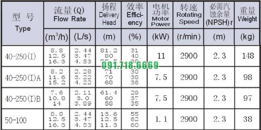 Bảng thông số kỹ thuật bơm nước li tâm trục ngang model SLW-ISW40-250-I lưu lượng từ 8.8 m3/h - 16.3 m3/h